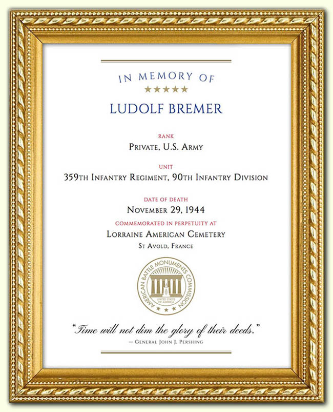 He was first buried in a temporary cemetery near Limey, France and moved in 1949 to a permanent grave in the Lorraine American Cemetery and Memorial at St. Avold, France. It is a beautiful resting place for more than 10,000 American soldiers who gave the ultimate sacrifice for their country. I am happy for my father that he is in such a beautiful place, but unhappy that his life ended so early.