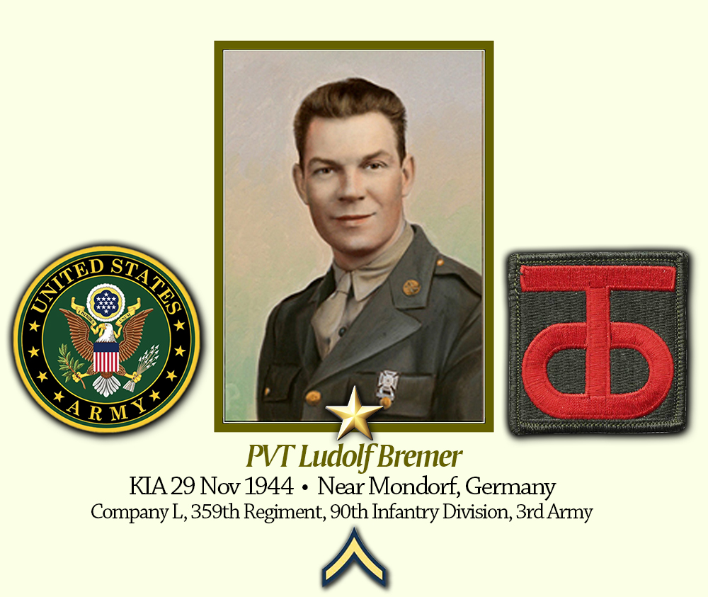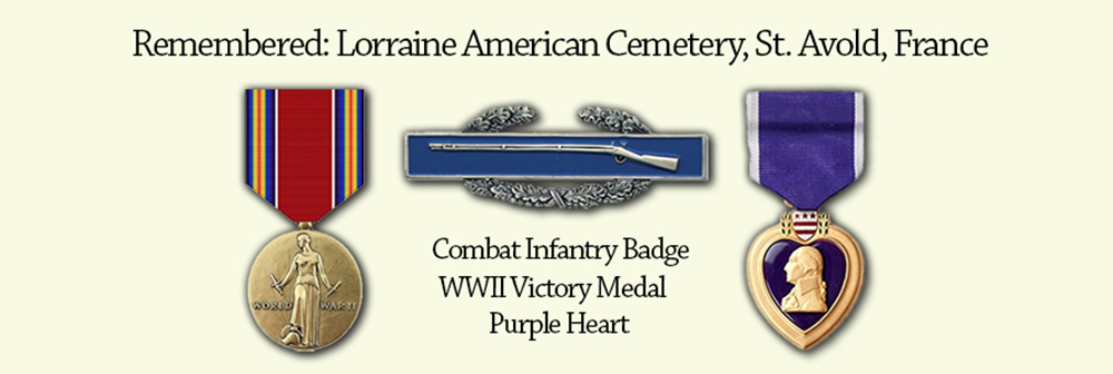 He was wounded on June 14, 1944, near Amfreville on the Normandy peninsular and returned to action on June 26, 1944. On November 29, 1944, he was killed by artillery fire, close to the border between France and Germany, near Mondorf, Germany. He was a Private in the 90th Division, 359th Regiment, Company L when he met his untimely death.