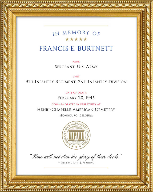 Sergeant Burtnett was awarded the Purple Heart posthumously for having made the supreme sacrifice in the defense of his country and its European allies and the Bronze Star Medal for exemplary conduct against the armed enemy on or about 9, November, 1944. He is buried in the Henri-Chappelle American Cemetery in Henri-Chappelle, Belgium (Plot D, Row 10, Grave 14).