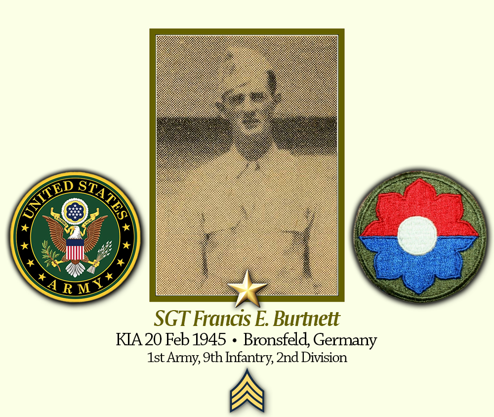 Sgt. Francis E. Burtnett (# 33 931 436) was born in Hollidaysburg, Pennsylvania on April 9, 1912. His parents were William J. and Margaret Finn Burtnett. He was a student and altar boy at St. Michael’s Roman Catholic Church and Elementary School and a graduate of Hollidaysburg High School.
