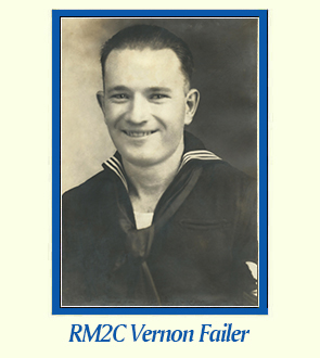 My father, Vernon Failer, Second Class Radioman (RM2), was born in Sedalia, MO. 1906 or 1908, to Clara May (Bunker). Her parents were (George and Evelyn A. Smith). In Clara's first marriage, to John Milo Crout, Dad was named Vernon Lester Crout, one of several children. When he and his sister Dorothy were adopted by a farm family (William and Mary Failer) in Sedalia, MO., Lester was dropped. He became Vernon Failer.