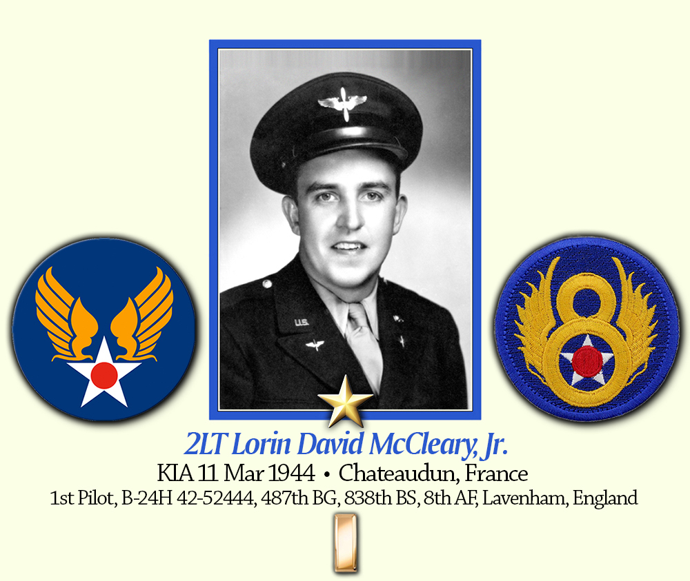 I am the son of Lorin D. McCleary. My father was killed 4 1/2 months before I was born so I never had the opportunity to know him. I wish that I had with all my soul. My father, his crew and the other men of the 8th Air Force were brave men. Somehow, they found the courage to fly into combat daily in early 1944, knowing that the odds of going untouched were 9 to 1 against them. From January 1 to June 30, 1944, for each 1000 heavy bomber crewmen, 712 were classified as killed or missing, and another 175 were wounded for a total of 887 casualties for each 1000 men. I dedicate this to the Memory of the Brave Men of B 24H 42-52444 who died together on May 11, 1944: Lorin D. McCleary, 2nd Lt., Pilot; Ernest E. McCoy, 2nd Lt., Co-Pilot; Joseph D. Perry, 2nd Lt., Bombardier; Victor S. Kramer, 2nd Lt., Navigator; Eugene McKee, S/Sgt.; Arthur C. Frey, Sgt.; Paul K. Churm, Sgt.; Clemente M. Barboza, Sgt.; Dale L. Knapp, Sgt. and to all the Brave Men of the 8th Air Force who lost their lives in the skies over Europe. You are not forgotten.