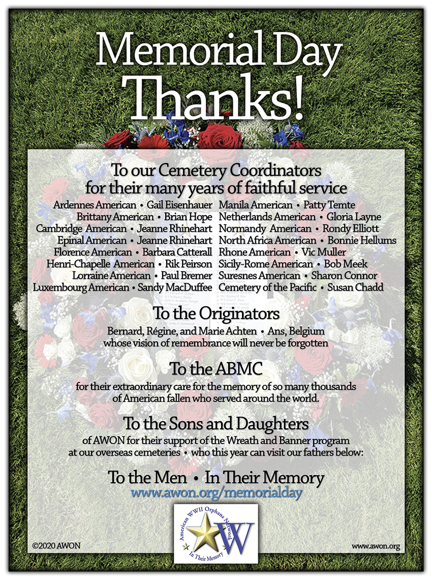 If this is your first time here ~ and your father or loved one was KIA in WWII ~ please join us.To learn more about AWON Membership, Click Here.